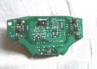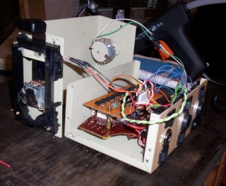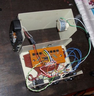 Die AusführungDie Platine habe ich aus dem Lenkrad ausgebaut, etwas zurechtgesägt, damit sie besser ins Kästchen passt, und Kabel an die beiden Pole der Taster gelötet. Alle neuen Teile fanden Platz auf einem kleinen Stück Lochrasterplatine, das ich über der Lenkrad-Platine platzierte. Dieses Sandwich passte gerade in das Kästchen. Die Kabel aus dem Lenkrad habe ich nach hinten und nach oben schließlich an der Rückseite in das Kästchen geführt. Mit Hilfe von Stiftleisten und Kabelstecker ist das Ganze auseinandernehmbar zusammengesteckt. An der rechten Seite des Kästchens habe ich den ehemaligen Umschalter angebracht, der nun als Fahrwerkhebel dienen soll. Er kennt nur zwei Stellungen, früher Computer A oder B, nun Ein/Aus für das Fahrwerk. Statt des Drehknopfes steckt jetzt der Arm einer 5,25-Zoll-Festplatte auf dem Umschalter, und zwar so, dass der Arm bis über die Frontplatte hinausragt und in der Stellung "Fahrwerk eingefahren" auffällig nach oben ragt. Die linke Seite ziert als "Parkbremse" eine Konstruktion aus einem Schlitten eines CD-ROM-Laufwerks, auf dem der Lesekopf vor und zurück fährt, sowie weiterer Kleinteile aus dem Laufwerk. Der Kunststoffträger musste hier und da zurechtgestutzt und wieder zusammengeklebt werden, damit er nicht über den Kasten hinausragt. Der ehemalige Lesekopf ist seiner Innereien beraubt und wird von einer Feder zurückgehalten. Die Schaltfunktion ergibt sich, wenn der Kopf mittels eines zurechtgebogenen Slotblechs nach vorne gezogen wird. An der Vorderseite des Rahmens stößt der Kopf dann an einen Minischalter und löst den Tastimpuls aus. Zuletzt verlegte ich die Leuchtdiode, die ehemals in der Lenkradmitte die Betriebsbereitschaft (USB-Kabel steckt im PC) anzeigte, an das Frontpanel neben den "Zündschlüssel". Auf die andere Seite des Schlüsselschalters platzierte ich eine weitere Diode, die anzeigen soll, wenn der Schlüssel auf "on" geschaltet ist. Damit auch im abgedunkelten Zimmer auf "on" stehende Schalter erkennbar sind, habe ich zum Abschluss die dann herausstehende Seite des Kippelements mit weißem Nagellack bepinselt. Als zusätzlichen "Leuchteffekt" hilft es, auf den trockenen Nagellack mit einem gelben Textmarker zu streichen. |