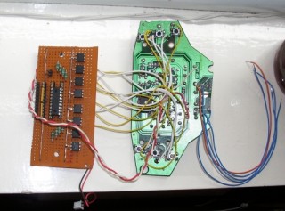 Der ehemaliger Umschalter wird Fahrwerk-Hebel Die Lenkrad-Elektronik ... ... etwas passend gekappt Der Konverter-Baustein "Schalter zu Taster"